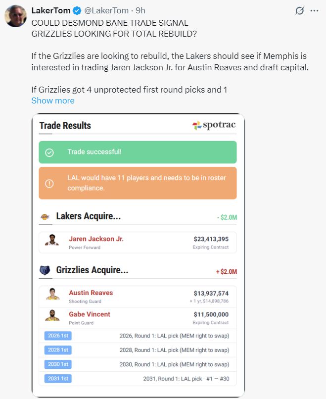 湖媒Laker Tom立马发声:湖人的确应该追求小贾伦。如果孟菲斯想要重建,湖人引进小贾伦就是取代安东尼-戴维斯最好的方案,只是贝恩都换4个首轮签+1个首轮互换,灰熊想从小贾伦这里得到些什么呢?